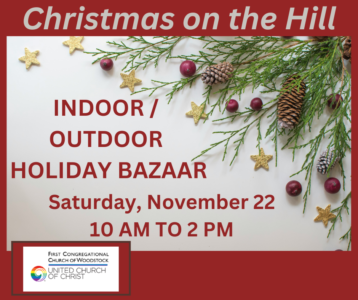 We’ll have beautiful greens arrangements and balsam wreaths at the bazaar on the front lawn. You will also find unique holiday gift items at our ‘Handmade in the Quiet Corner’ table. Aunt Mimi’s Attic Treasures includes jewelry and handbags. Santa’s Toy Chest has gently used toys and the Unique Boutique has all things Christmas—mugs, dishes, ornaments, and decorations. This year we are also including the SERRV table of handcrafted fair-trade items made in third world countries.