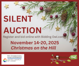 We are collecting donations for Silent Auction, plus jewelry, children’s toys, holiday decorations. Look through your attic, cull through jewelry (both costume and heirloom!), and gather up toys and puzzles. Get crafty and make something for our handmade table. Please leave your things on the table in Harrison Hall from November 2-9.
