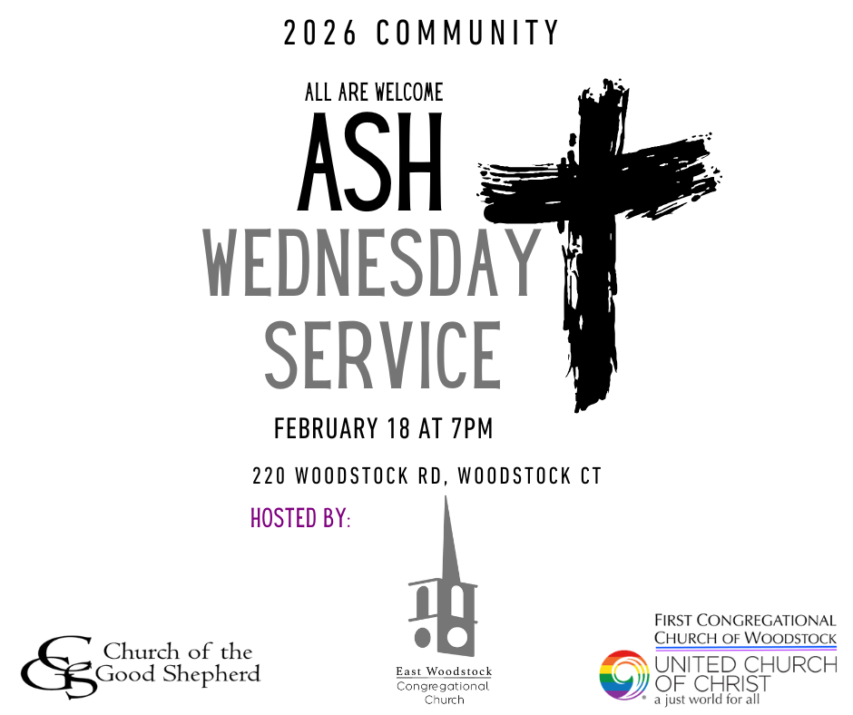 As is our tradition, our congregation, Church of the Good Shepherd, and East Woodstock will celebrate a community Ash Wednesday service. This year the service will be held at East Woodstock Congregational Church. Worship will include reflection, communion, imposition of Ashes, and a joint choir.