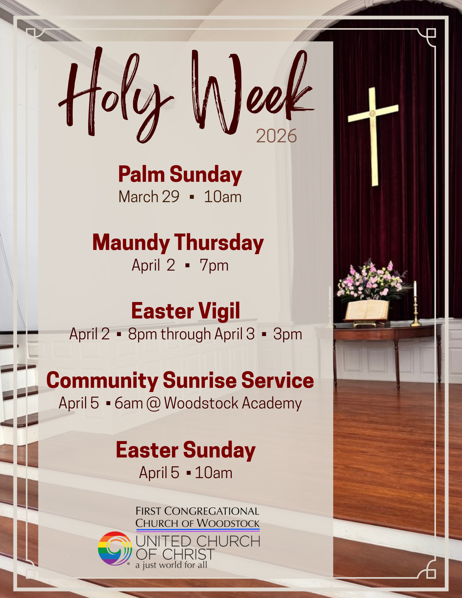 In Person: 10:00 AM at First Congregational Church of Woodstock Online: 7:00 PM
